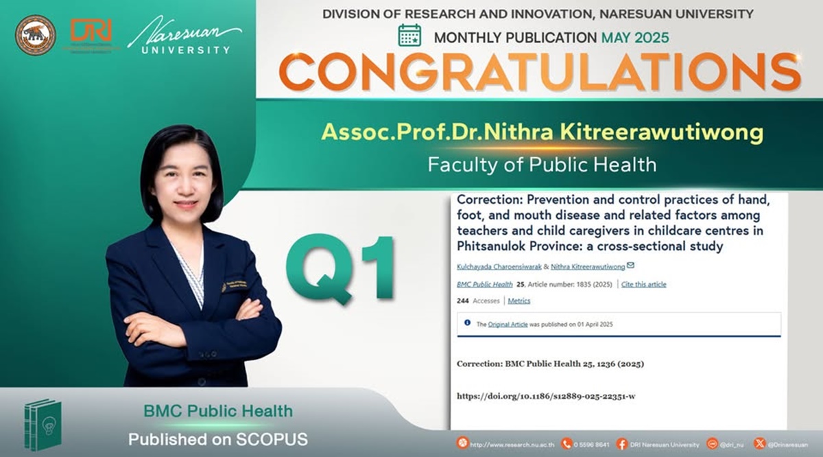 Congratulations to Assoc.Prof.Dr.Nithra Kitreerawutiwong-19052025 Congratulations to Assoc.Prof.Dr.Nithra Kitreerawutiwong Published in International Journal on SCOPUS Click link Related posts:กิจกรรมประจำเดือนพฤศจิกายน 2567-2ศิษย์เก่าดีเด่นรุ่นใหม่-ดร.นันทิกา พรหมมีศิษย์เก่าดีเด่นสาขาวิทยาศาสตร์สุขภาพ มหาวิทยาลัยเชียงใหม่-CMU
