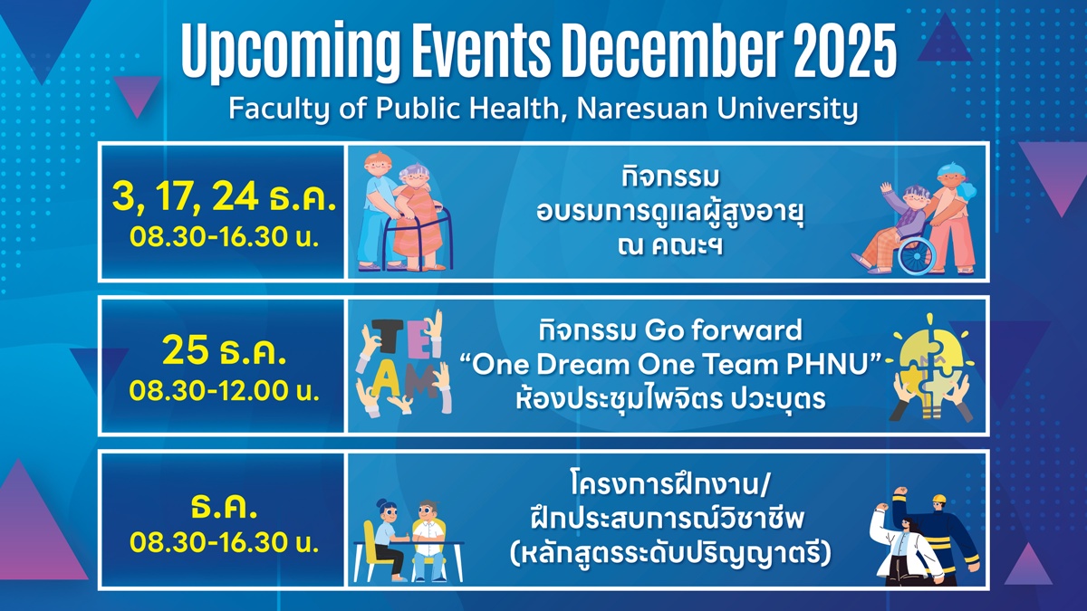 กิจกรรมประจำเดือนธันวาคม 2568-1 Related posts:NU Idea Pitch Day 2025กิจกรรมประจำเดือนกรกฎาคม 2568EdPEx - ปีการศึกษา 2566 คณะสาธารณสุขศาสตร์ มหาวิทยาลัยนเรศวร