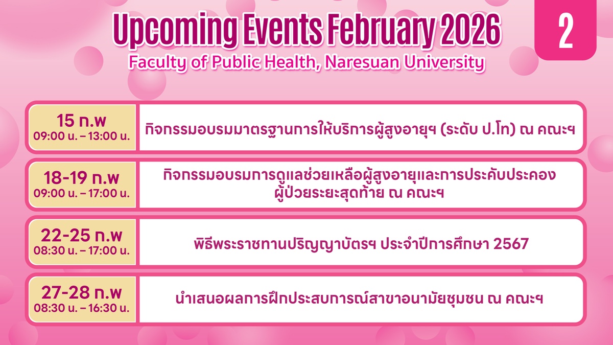 กิจกรรมประจำเดือนกุมภาพันธ์ 2569-2 Related posts:กิจกรรมประจำเดือนพฤศจิกายน 2567-1Congratulations to Assoc.Prof.Dr.Chakkraphan Phetphumขอเชิญเข้าร่วมพิธีทำบุญและสถาปนาคณะสาธารณสุขศาสตร์ครบรอบ 20 ปี