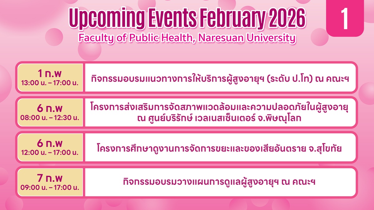 กิจกรรมประจำเดือนกุมภาพันธ์ 2569-1 Related posts:ถึงเวลาลด งดสร้างขยะเพิ่มนักวิจัยคณะสาธารณสุขศาสตร์ในงานประชุมสุดยอดสุขภาพพิภพโลก PHAM2024กิจกรรมประจำเดือนมกราคา 2569-1