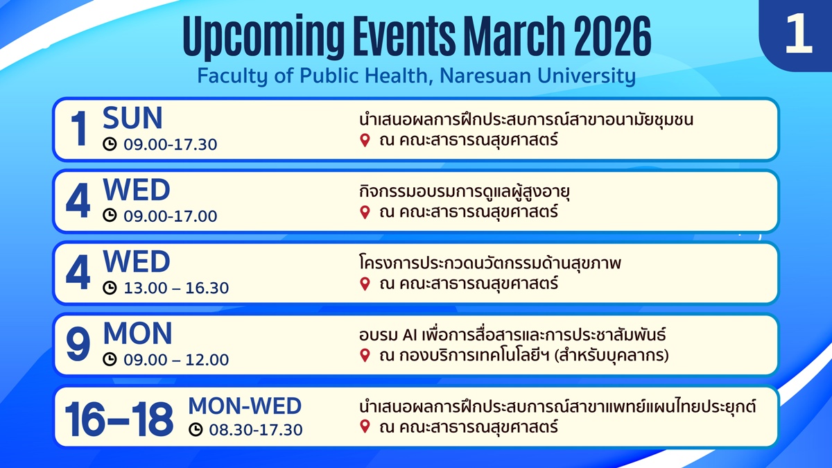 กิจกรรมประจำเดือนมีนาคม 2569-1 Related posts:กิจกรรมเตรียมความพร้อมและวางแผนเพื่อพัฒนาหลักสูตร ครั้งที่ 2 Congratulations to Dr.Sudawadee Yasakaงานประชุมวิชาการสาธารณสุขระหว่างสถาบันระดับนานาชาติ ครั้งที่ 4