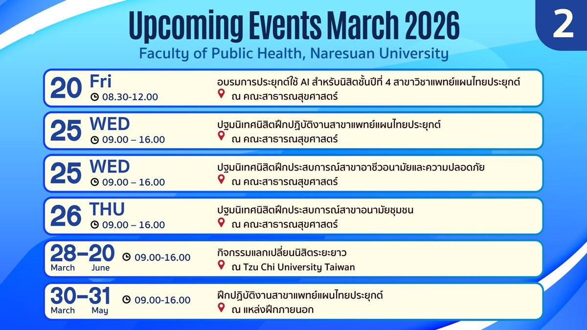 กิจกรรมประจำเดือนมีนาคม 2569-2 Related posts:ขอแสดงความยินดีกับ วารสารวิจัยสาธารณสุขและวิทยาศาสตร์สุขภาพน้อมรำลึกในพระมหากรุณาธิคุณอันหาที่สุดมิได้สมเด็จพระนางเจ้าสิริกิติ์พระบรมราชินีนาถพระบรมราชชนนีพันป...การประชุมสุดยอดสุขภาพพิภพโลก PHAM2024