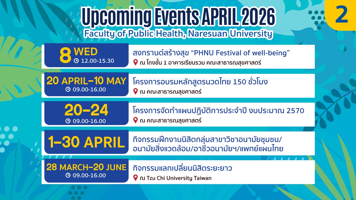 กิจกรรมประจำเดือนเมษายน 2569-2 Related posts:กิจกรรมประจำเดือนเมษายน 2567งานประชุมวิชาการสาธารณสุขระหว่างสถาบันระดับนานาชาติ ครั้งที่ 4กิจกรรมประจำเดือนตุลาคม 2567