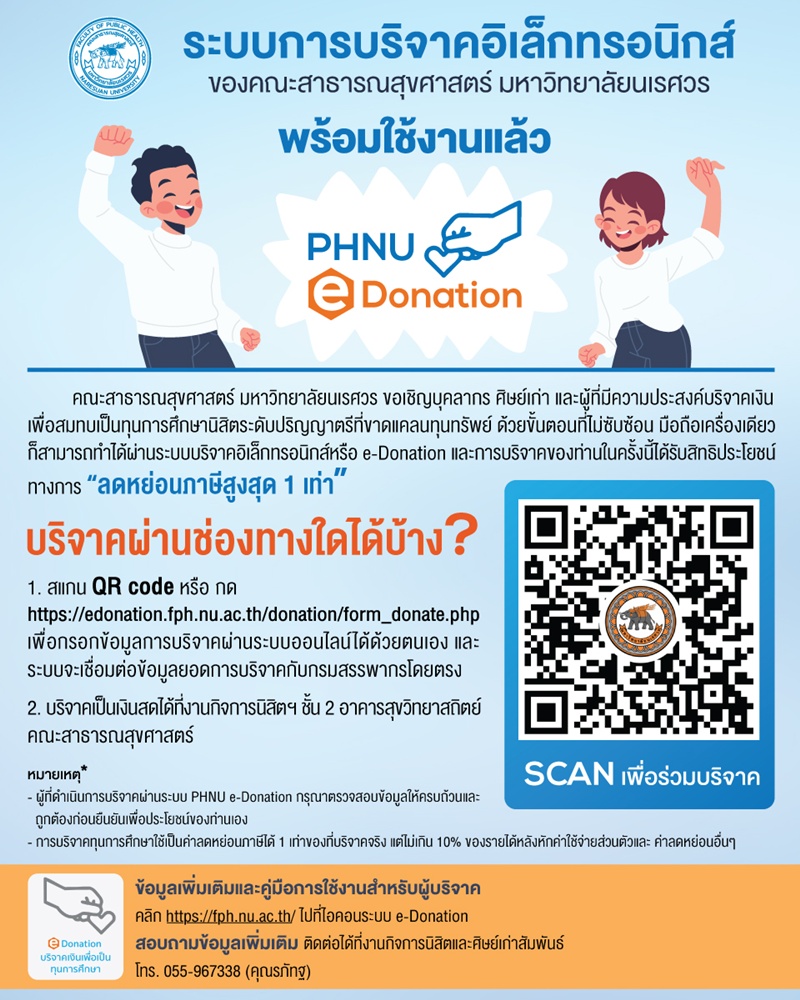 คณะสาธารณสุขศาสตร์ มหาวิทยาลัยนเรศวร จัดทำระบบบริจาคอิเล็กทรอนิกส์ หรือ e-Donation เพื่ออำนวยความสะดวกแก่ผู้ที่มีความประสงค์บริจาคเงินเพื่อสมทบทุนเพื่อมอบเป็นทุนการศึกษาของนิสิตปริญญาตรีที่ขาดแคลนทุนทรัพย์ การบริจาคสามารถดำเนินการผ่านระบบออนไลน์ได้ด้วยตนเองและระบบจะเชื่อมต่อข้อมูลการบริจาคกับกรมสรรพากรโดยตรง และได้รับสิทธิประโยชน์ทางการลดหย่อนภาษี